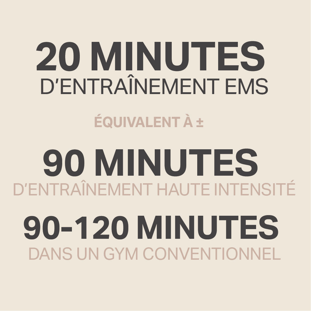 EMS est l'abréviation de Electrical Muscle Stimulation. Il fonctionne en envoyant des impulsions électriques à basse fréquence pour contracter manuellement vos fibres musculaires pendant que vous faites de l'exercice, augmentant ainsi l'intensité de votre entraînement.